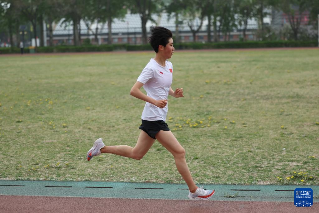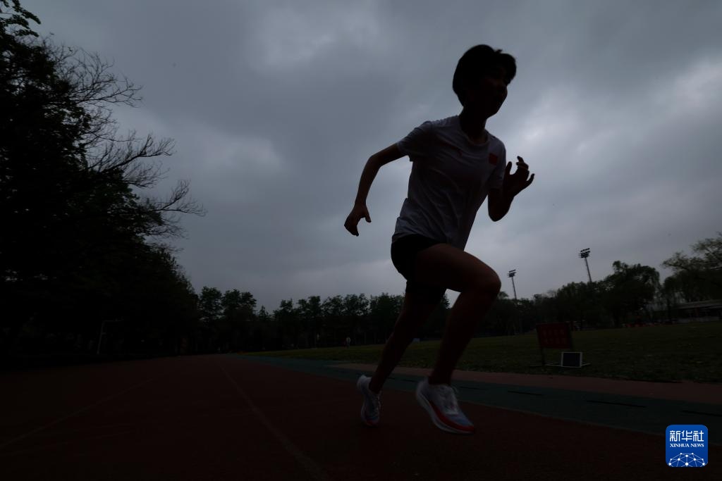 4月14日,参加集训的田径运动员王佳奇在室外田径场训练。新华社记者 李明 摄