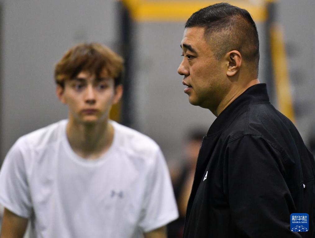 4月14日,参加集训的田径运动员艾力西尔·吾买尔的教练张洋(右)向记者介绍训练情况。新华社记者 宋彦桦 摄