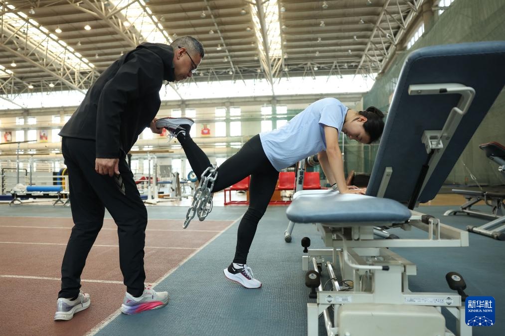 4月14日,参加集训的田径运动员陈妤颉(右)在国家队训练基地综合馆内训练。新华社记者 李明 摄
