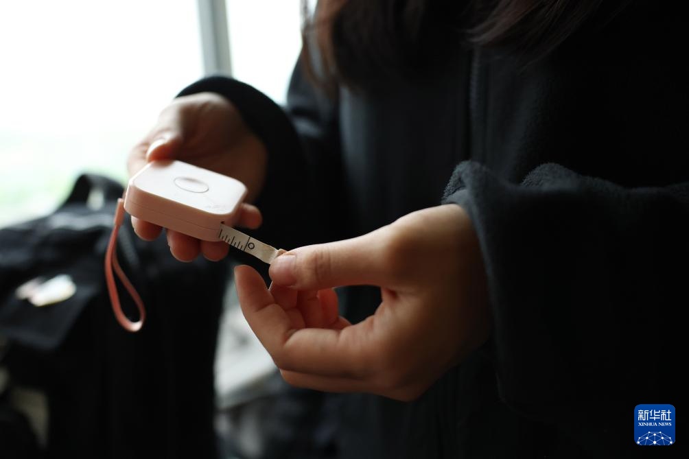4月14日,参加集训的田径运动员吴彬彬在运动员公寓内展示随身携带的皮尺。新华社记者 李明 摄