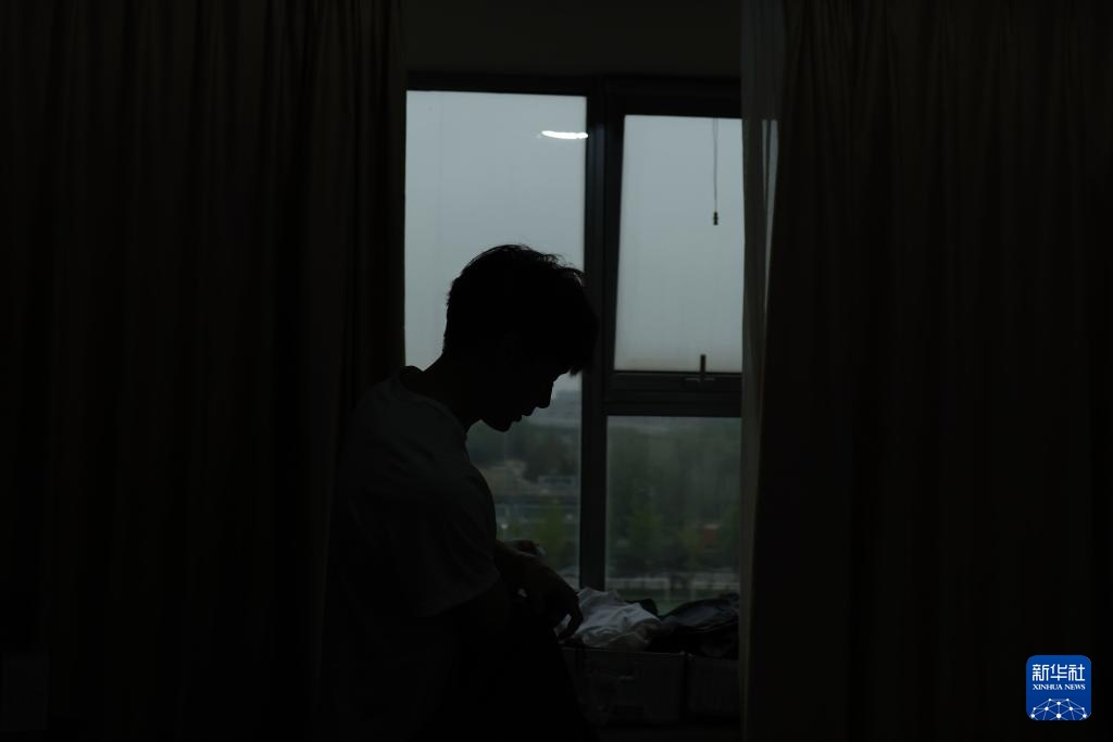 4月14日,参加集训的田径运动员艾力西尔·吾买尔在运动员公寓内准备上午训练用的衣服。新华社记者 李明 摄