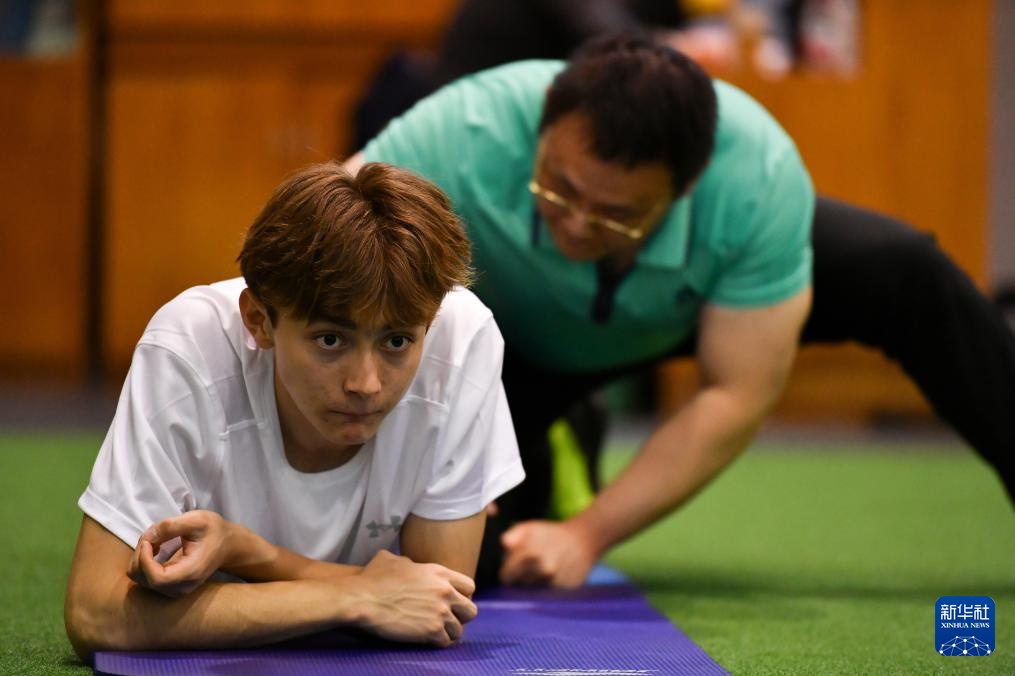 4月14日,参加集训的田径运动员艾力西尔·吾买尔(左)在体能训练中。新华社记者 宋彦桦 摄