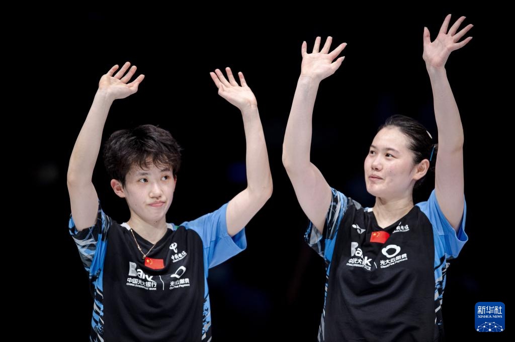 4月14日,白荷娜(右)/李绍希在比赛中庆祝得分。新华社记者 江汉 摄