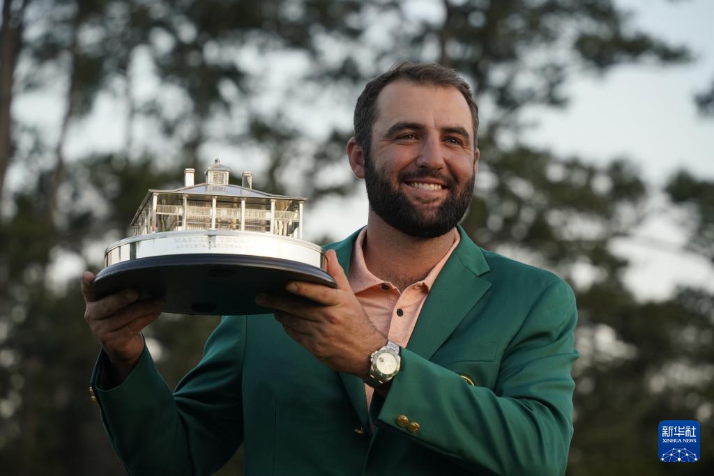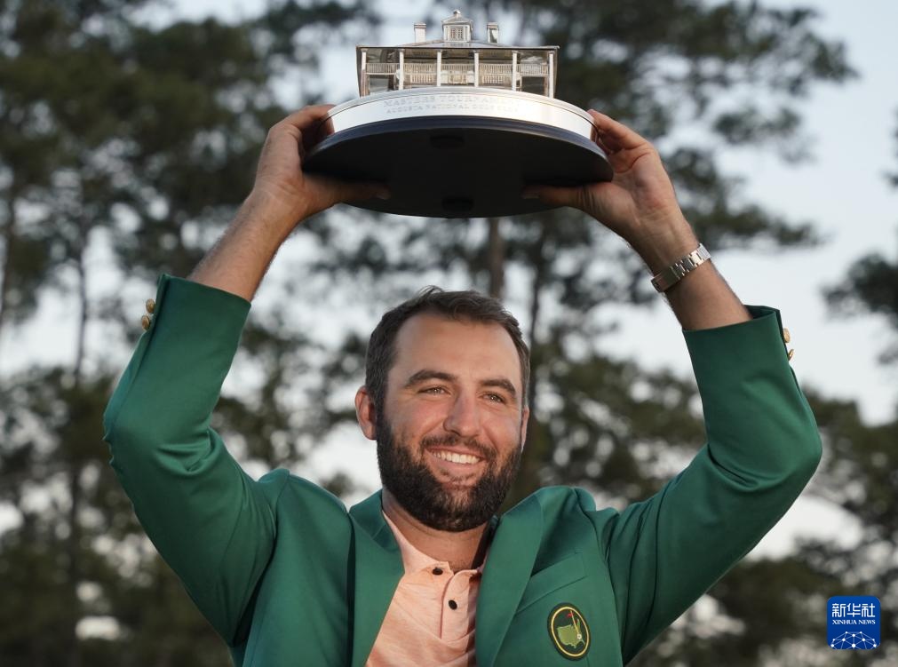 4月14日,美国选手斯科蒂·舍夫勒在颁奖仪式上捧起冠军奖杯。新华社记者 吴晓凌 摄