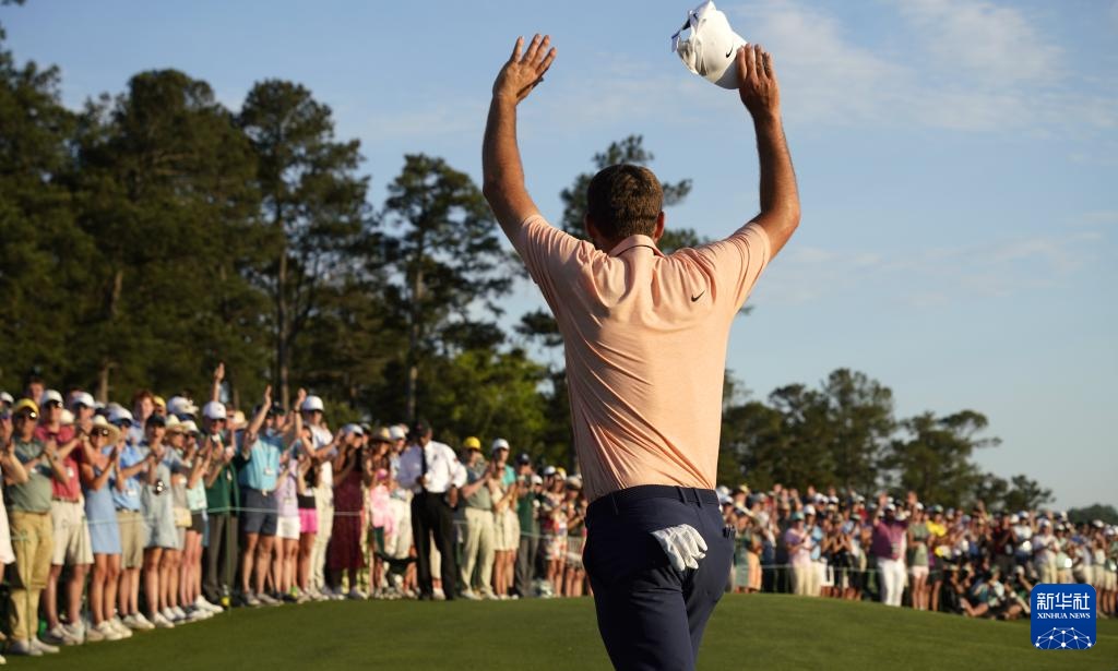 4月14日,美国选手斯科蒂·舍夫勒在获得冠军后庆祝。新华社记者 吴晓凌 摄