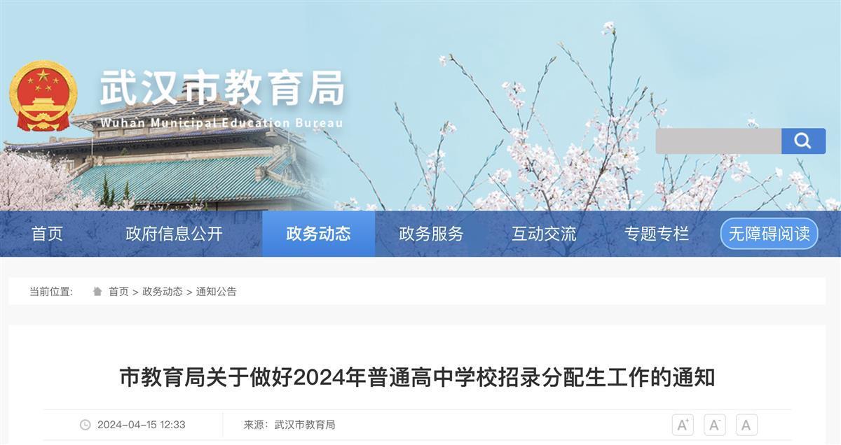 4月15日,武汉市教育局官网发布关于做好2024年普通高中学校招录分配生工作的通知与武汉市2024年分配生政策解读。