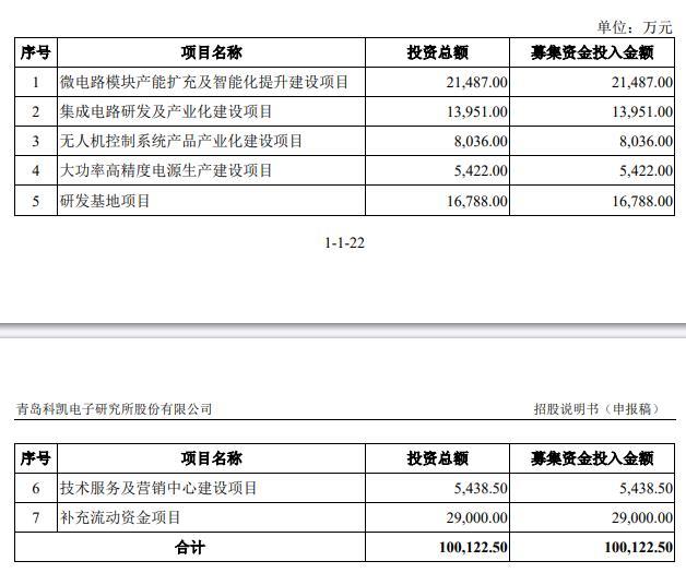 科凯电子本次发行股票数量不超过6,001万股(行使超额配售选择权之前),占发行后总股本的比例不低于15%;本次发行均为新股发行,原股东不进行公开发售股份。科凯电子原拟募集资金100,122.50万元,分别用于微电路模块产能扩充及智能化提升建设项目、集成电路研发及产业化建设项目、无人机控制系统产品产业化建设项目、大功率高精度电源生产建设项目、研发基地项目、技术服务及营销中心建设项目、补充流动资金项目。