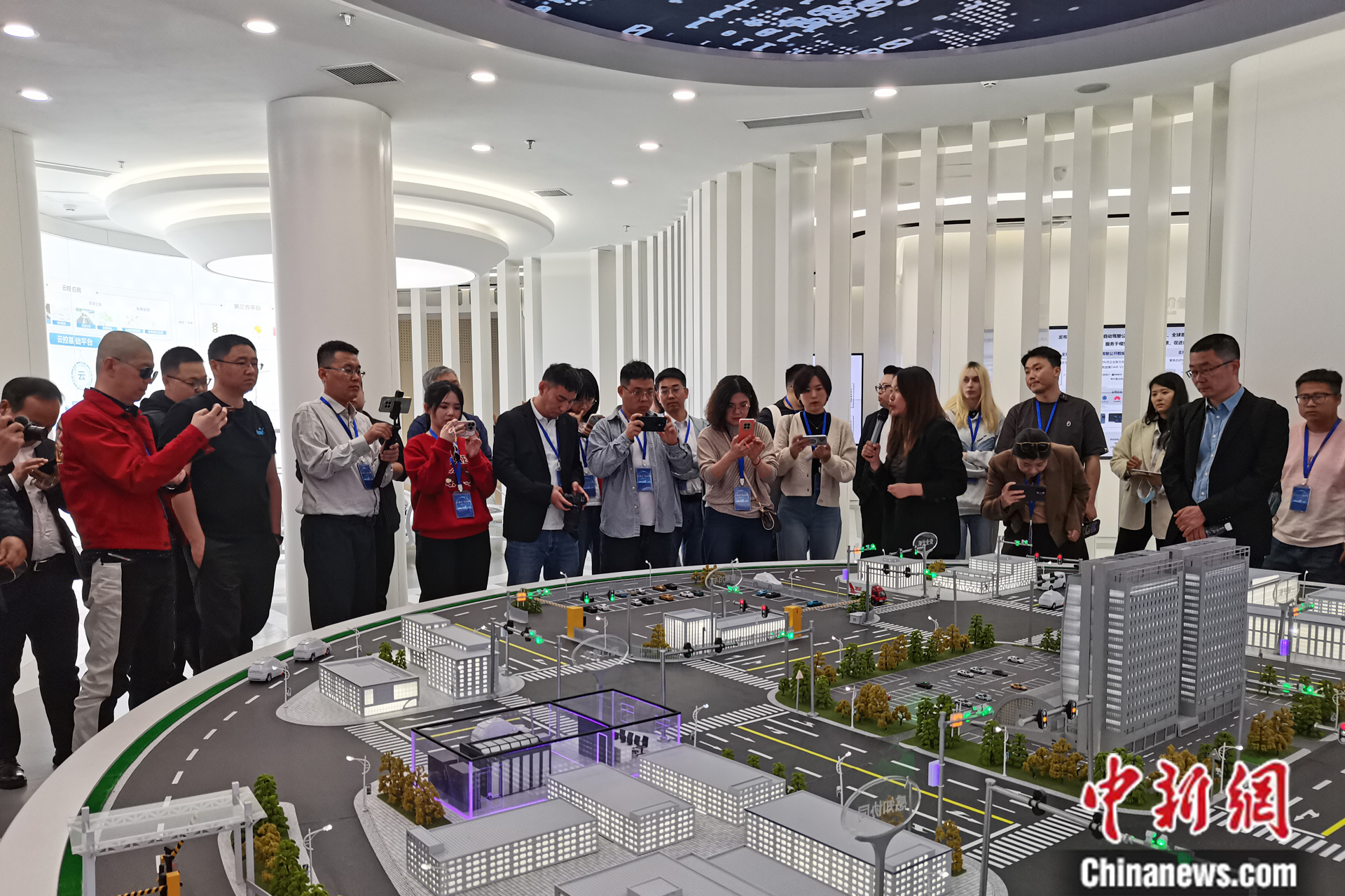 随后,4月16日下午,网络名人们来到北京市高级别自动驾驶示范区创新运营中心,通过宣传视频、电子展板、融合沙盘和实物产品,了解示范区建设成果、落地场景,以及产业生态建设情况。