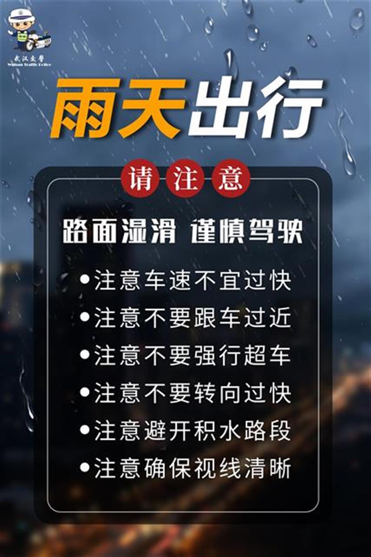 武汉交管部门启动恶劣天气应急预案,加大对全市高架、桥梁、隧道、铁路涵洞、低洼路段等重点区域的巡查频次,同时增派机动巡逻岗位,随时掌握全市道路交通状况;同时武汉交警将利用广播、电视、网络平台等全媒体渠道,发布交通安全预警提示,及时发布道路通行信息、临时管控措施和绕行线路,引导市民合理出行,全力保障道路通行安全有序。