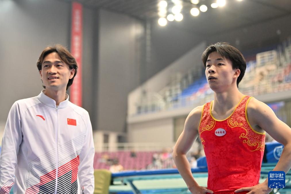 4月18日,湖南高速队选手严浪宇(右)在半决赛后观看回放视频。他以61.34分的成绩位列第一,晋级决赛。新华社记者 李然 摄