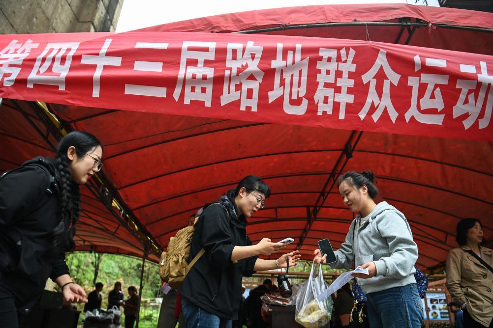 4月18日,一名参赛选手(左二)在赛场旁的农产品展销会上购买特色食品。新华社记者 邹竞一 摄