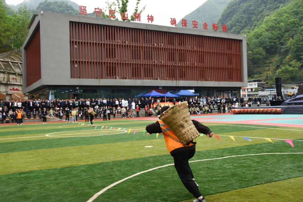 4月18日,参赛选手在运动会上参加背背篓比赛。新华社记者 林胜概 摄
