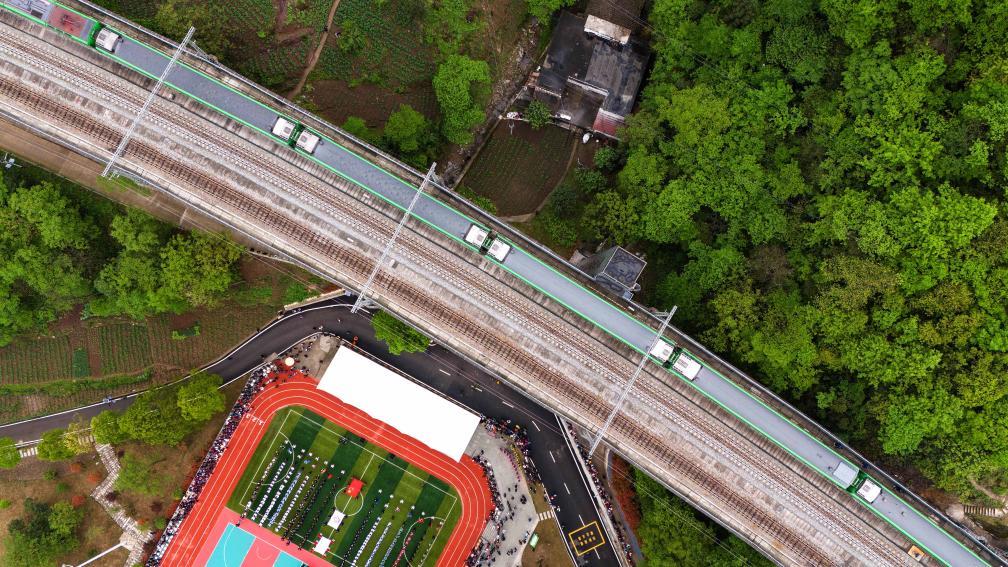 一声声呐喊,一阵阵欢笑,参赛者和观众沉浸在体育运动的激情中。在他们身后,是为运动会设计的一块大巴山造型的背景板:山体两侧,开进隧洞时的绿皮车,在冲出隧洞时已是“复兴号”。