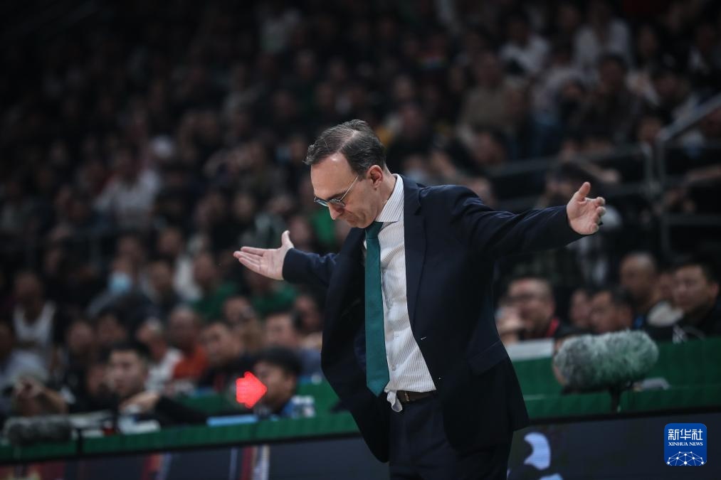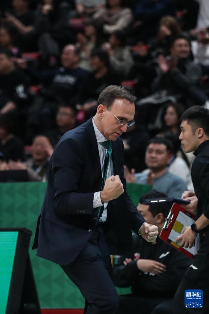 2023年11月12日,时任辽宁本钢队主教练的乌戈在球队主场对阵北京北汽队的比赛中庆祝。新华社记者 潘昱龙 摄