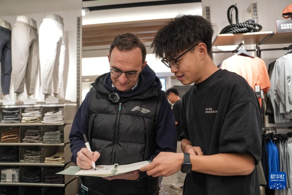 3月22日,乌戈在沈阳一商场内购物,导购员是他的粉丝,乌戈为其签名。新华社记者 潘昱龙 摄