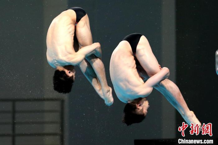 4月19日,在陕西西安进行的2024世界泳联跳水世界杯总决赛男子双人3米跳板决赛中,中国组合王宗源(左)/龙道一夺冠。 中新社记者 张远 摄