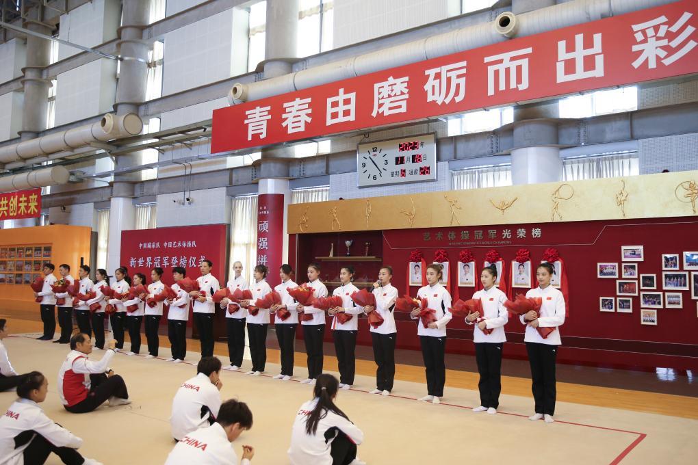 2023年11月18日,夺得世界冠军的中国蹦床队、中国艺术体操队运动员及其教练员在新世界冠军登榜仪式上接受祝贺。新华社记者 许雅楠 摄