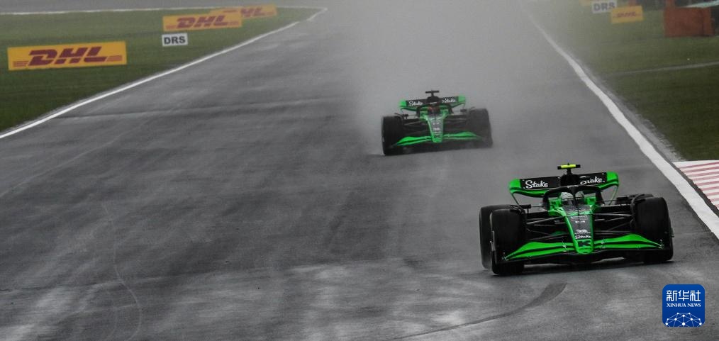 4月19日,索伯车队中国车手周冠宇(前)和队友芬兰车手博塔斯在比赛中。周冠宇最终排名第十,博塔斯排名第九。新华社记者 夏一方 摄
