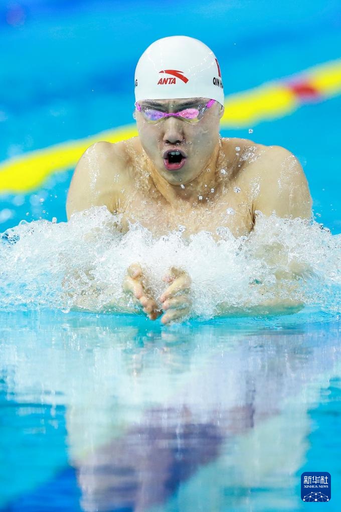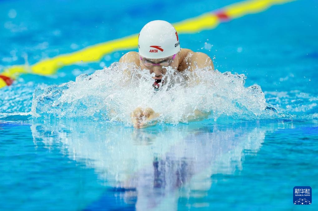 4月19日,上海安踏队选手覃海洋在男子100米蛙泳半决赛中。新华社发(彭志刚摄)