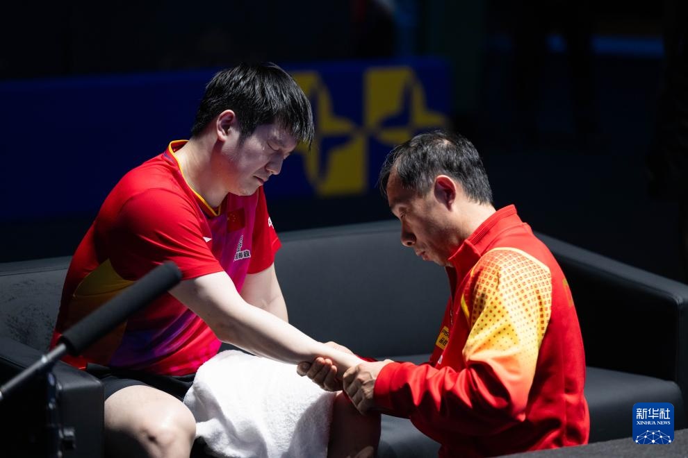 4月19日,樊振东(左)在比赛间隙接受治疗。新华社记者 张金加 摄