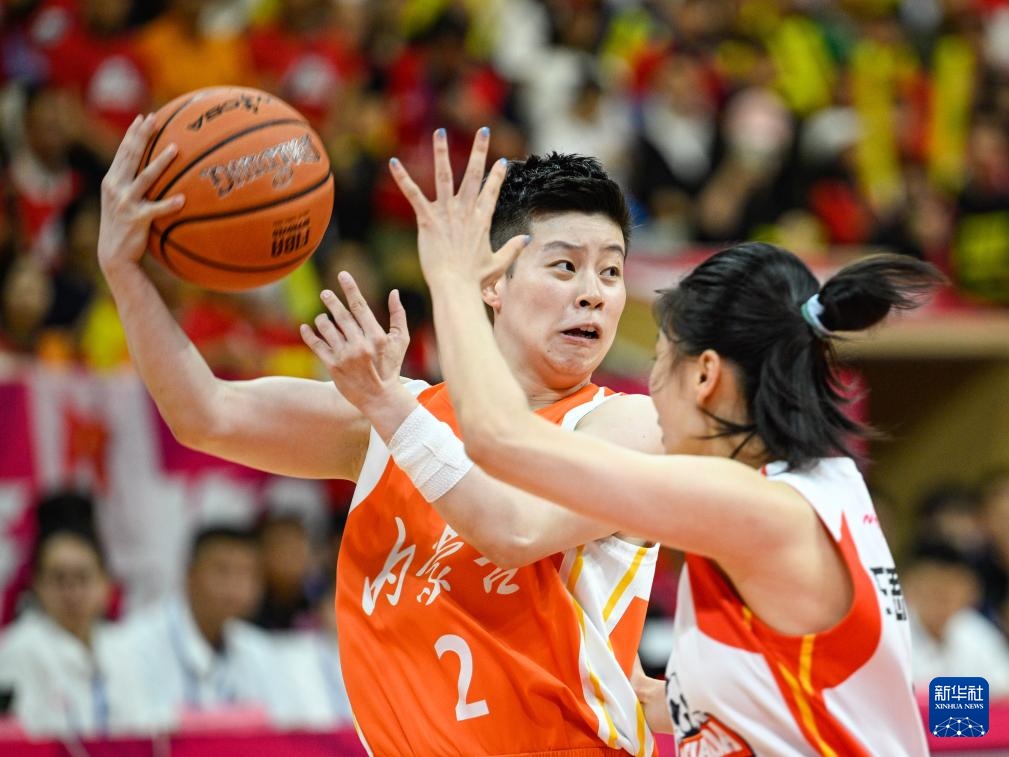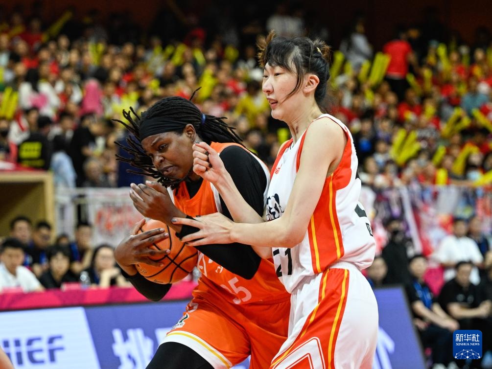 4月19日,内蒙古农信队球员孙梦然(右)与四川远达美乐队球员坎贝奇在比赛中拼抢。新华社记者 王曦 摄