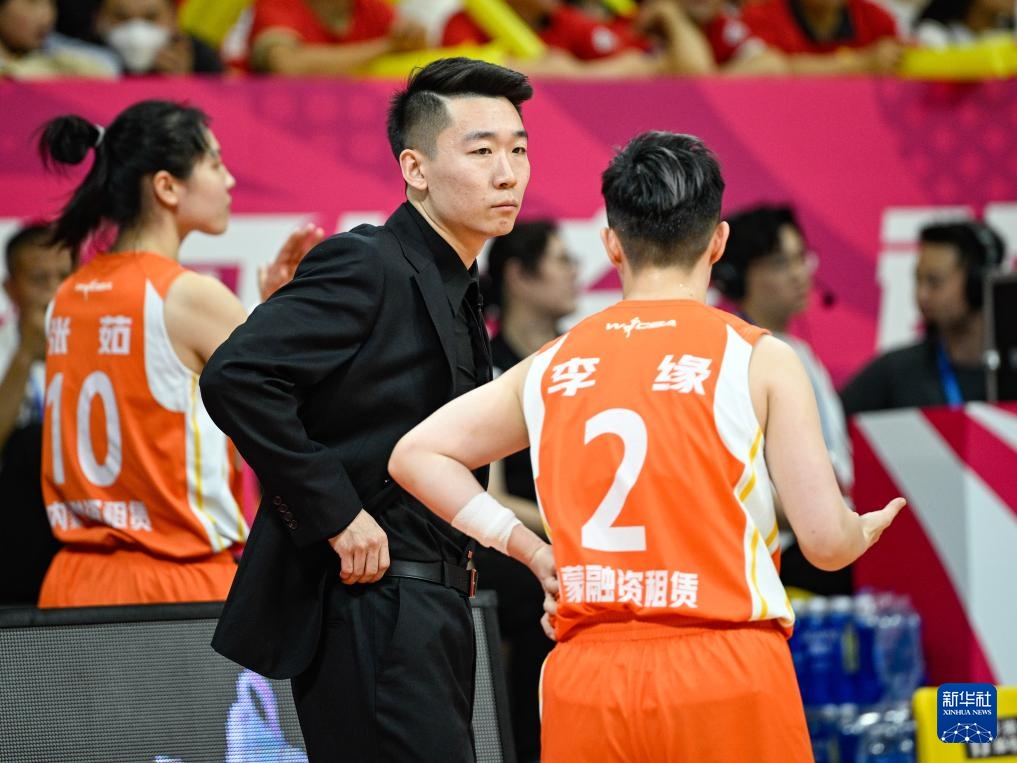 4月19日,内蒙古农信队主教练杨赞(左)在比赛中指导球员李缘。新华社记者 王曦 摄