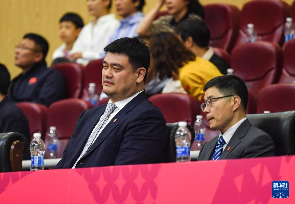 4月19日,中国篮球协会主席姚明(左)在场边观战。新华社记者 王曦 摄