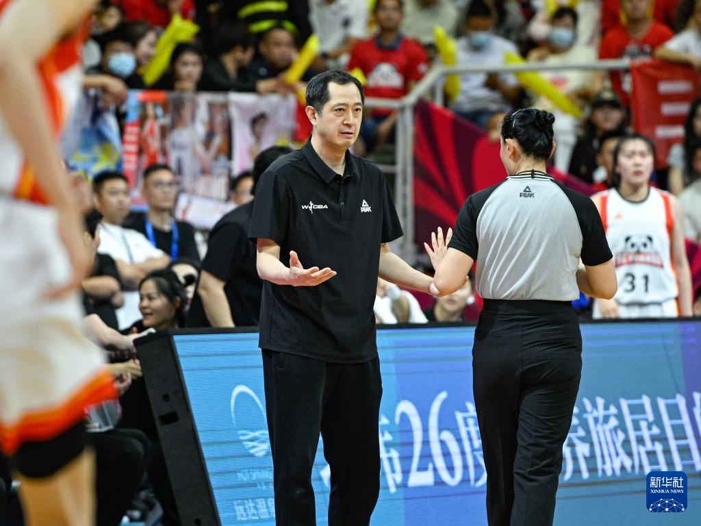4月19日,四川远达美乐队主教练杨毅(左)在比赛中和裁判交流。新华社记者 王曦 摄