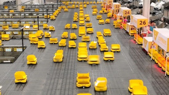 2023年11月8日,浙江湖州,德清县乾元镇第一产业智慧物流园区内,智能分拣机器人“小黄人”正在工作。