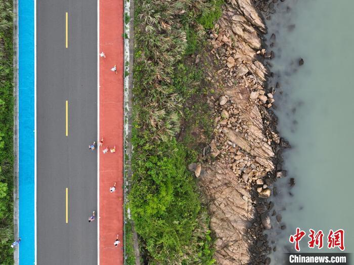 图为:参赛选手跑过滨海跑道。(无人机照片)中新网记者 王刚 摄