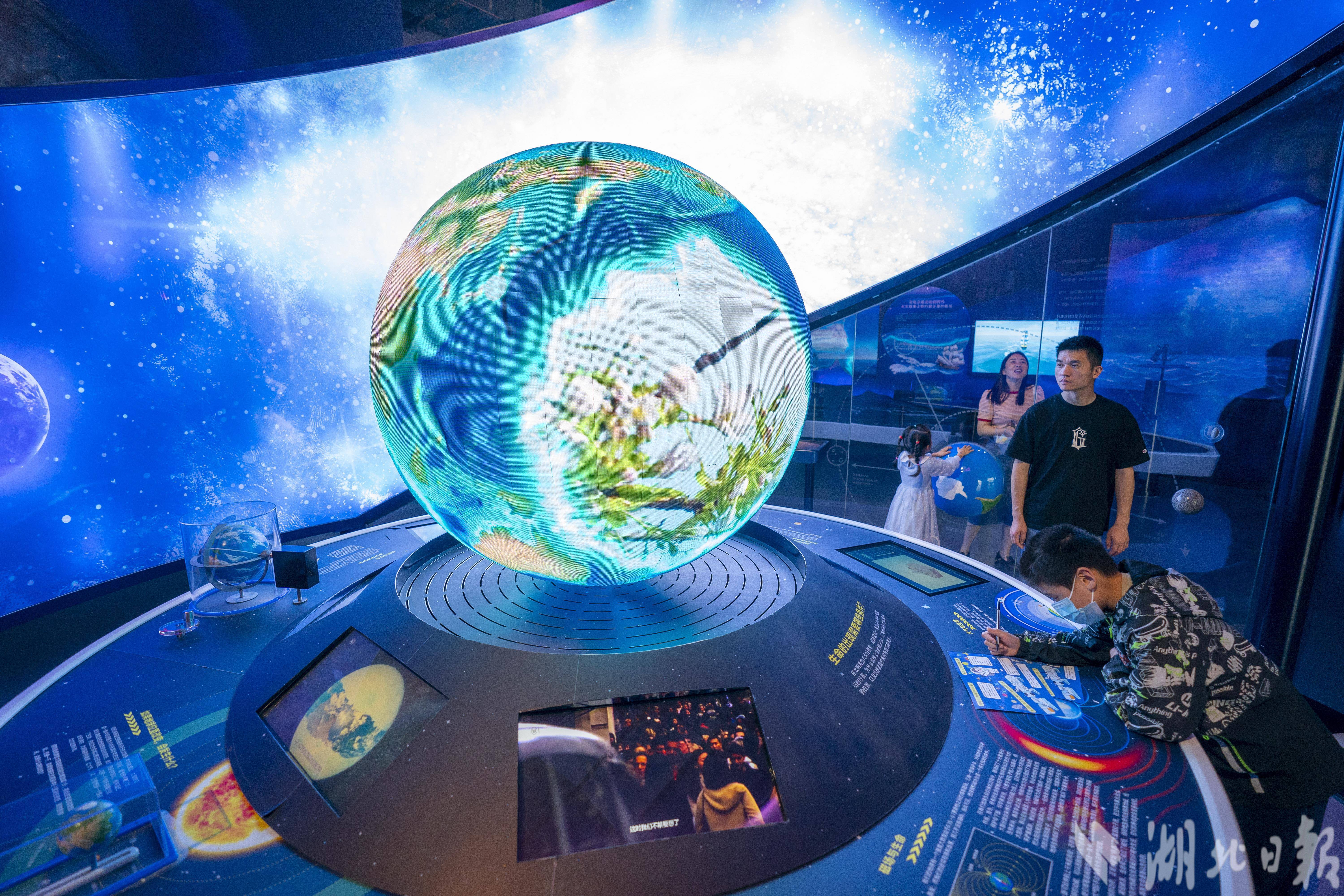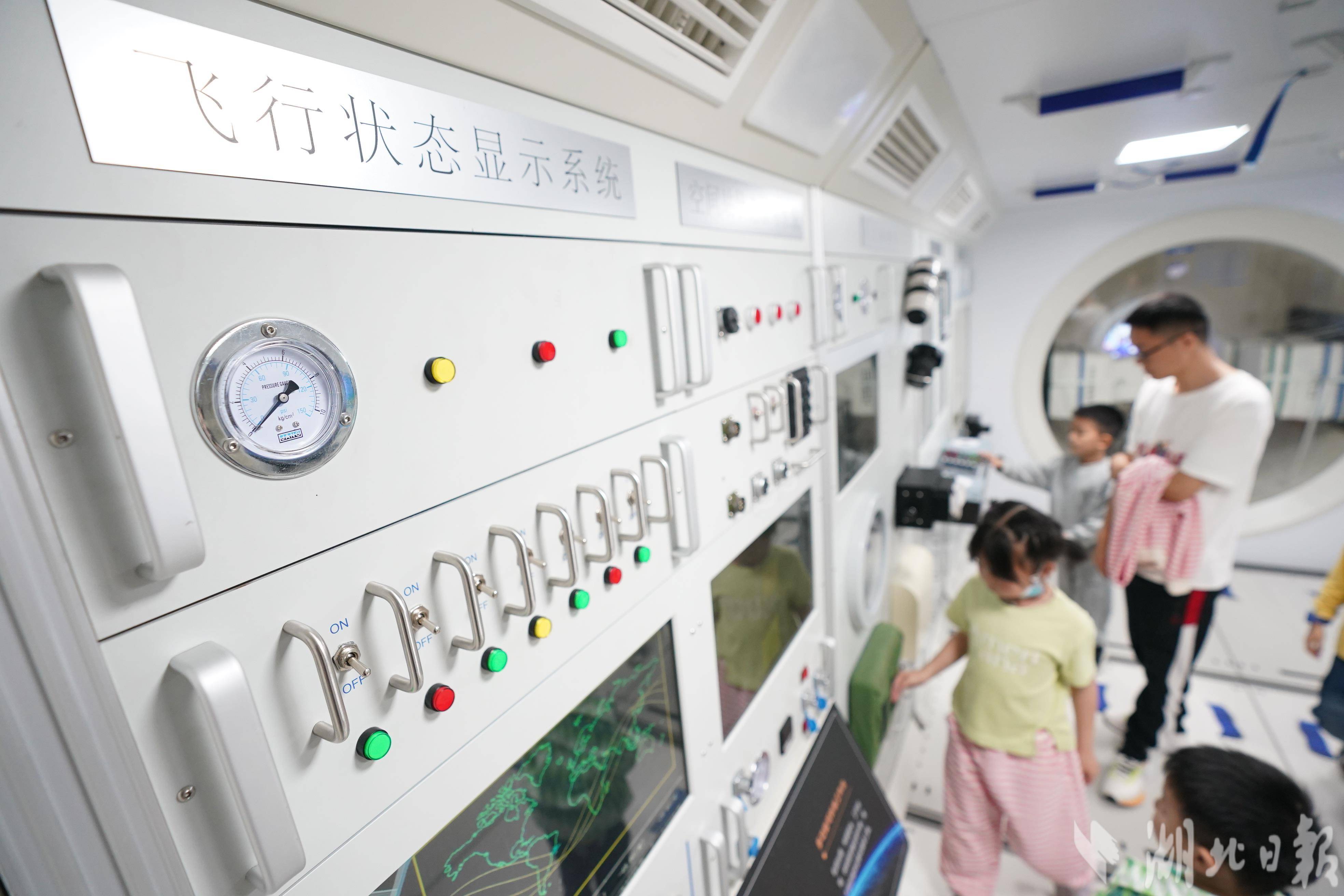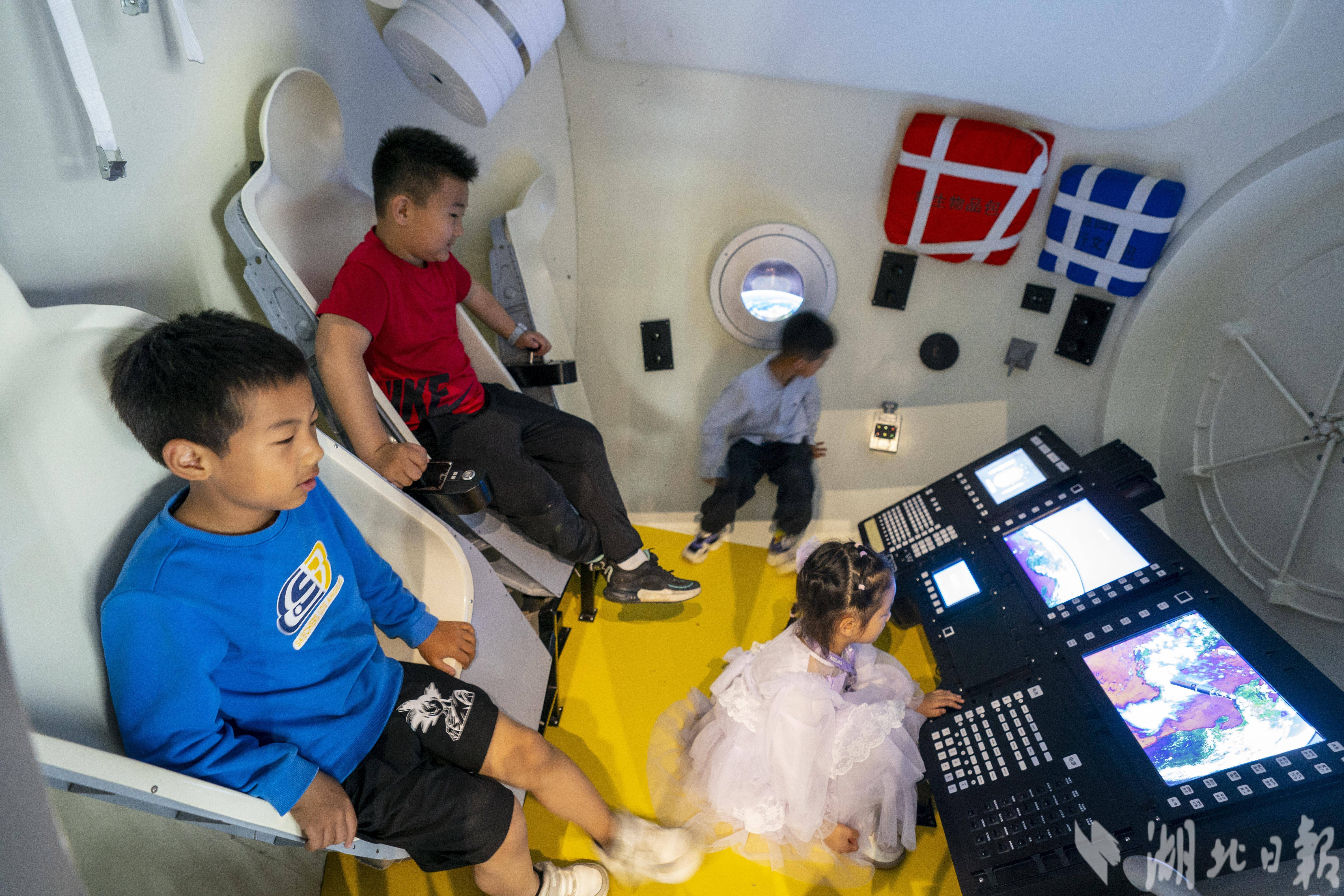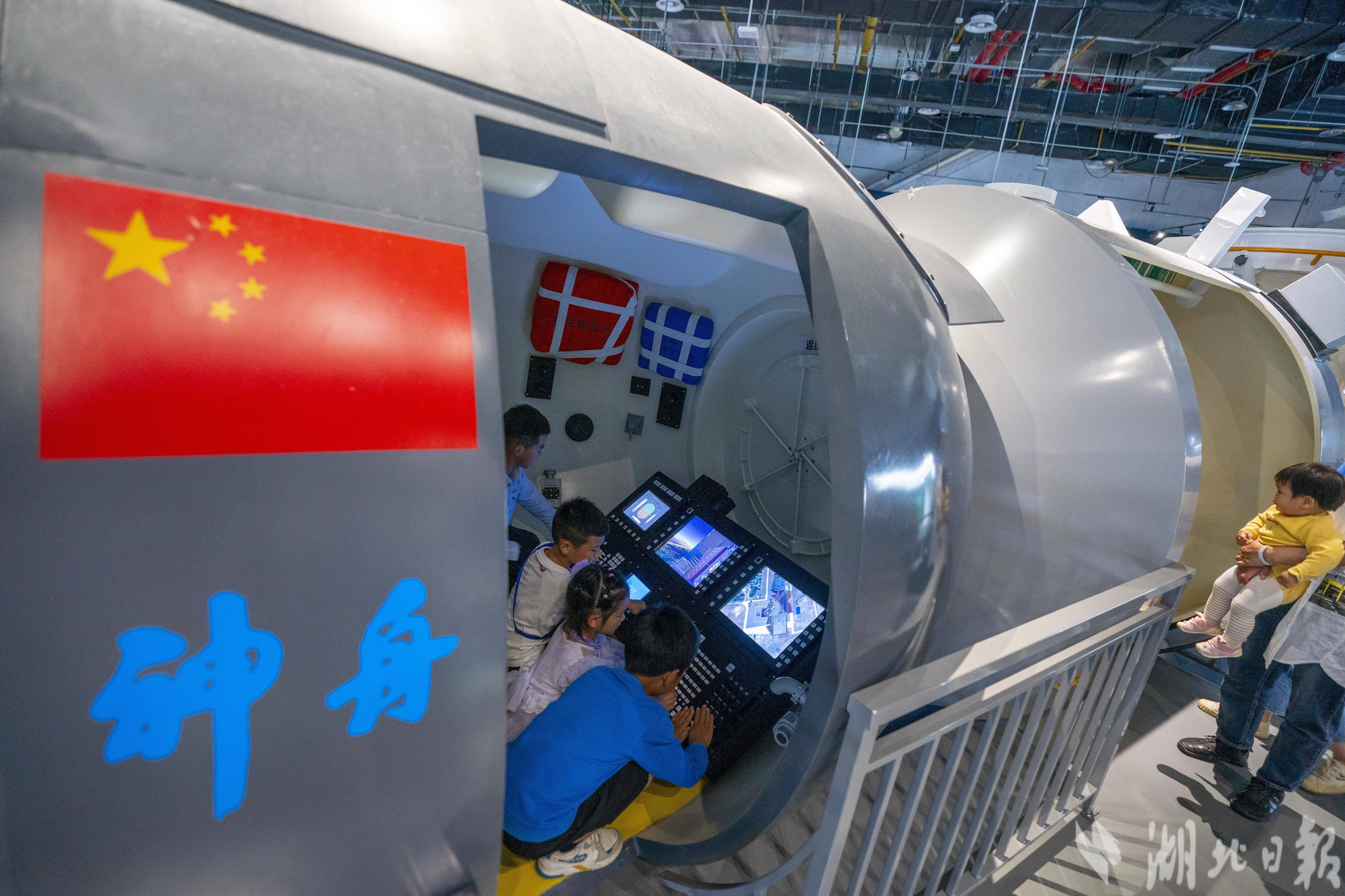 4月20日,湖北省科技馆,小观众们在神舟飞船、“天和号”空间站核心舱模型里体验太空飞行,探索航天奥秘。当天,除了常设专题展厅——“仰望星空”,省科技馆还上新2024年“中国航天日”专场航空航天纺织品展,集中展示了湖北高校、企业在航空航天纺织品领域的最新科技成果。