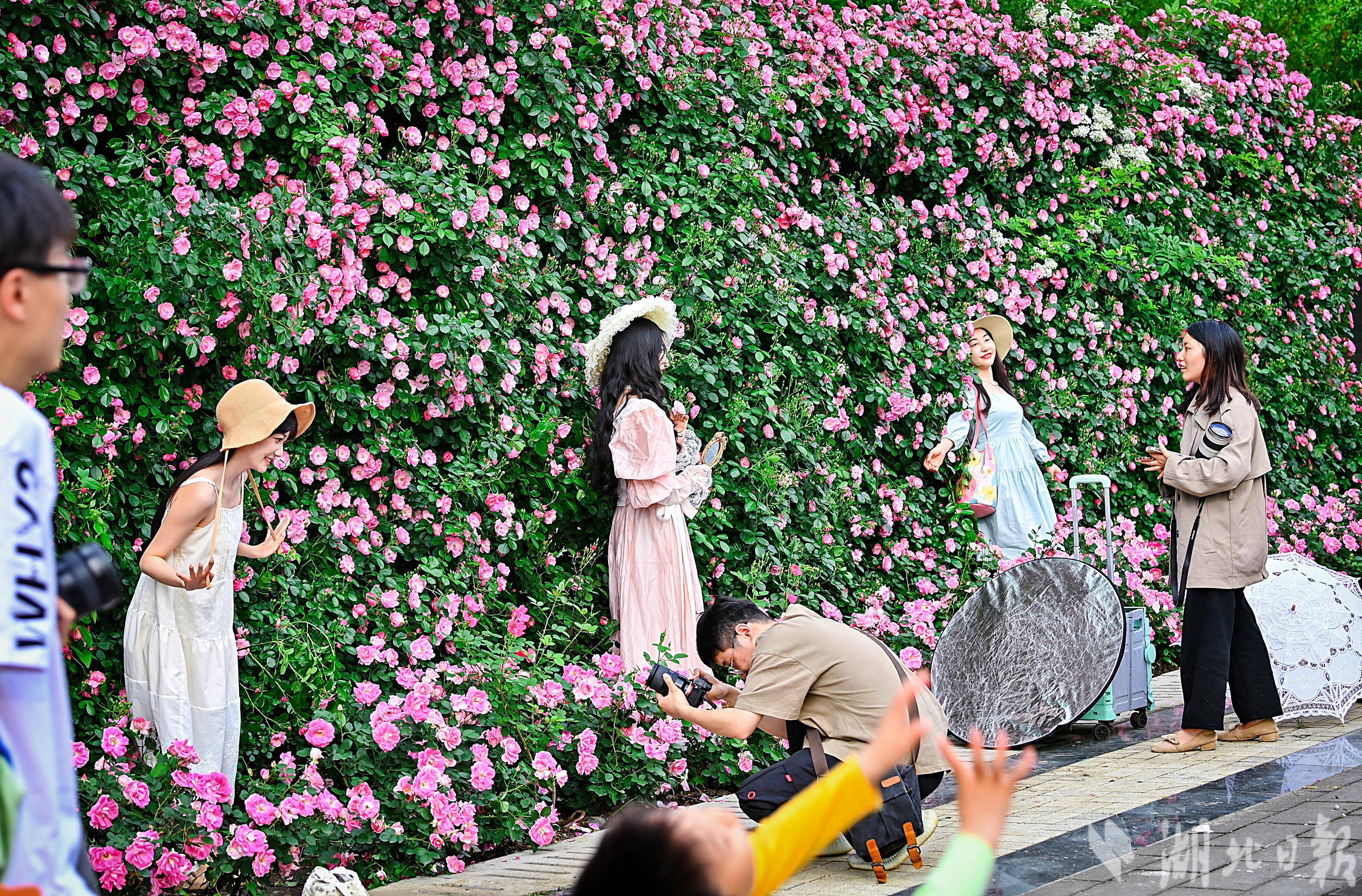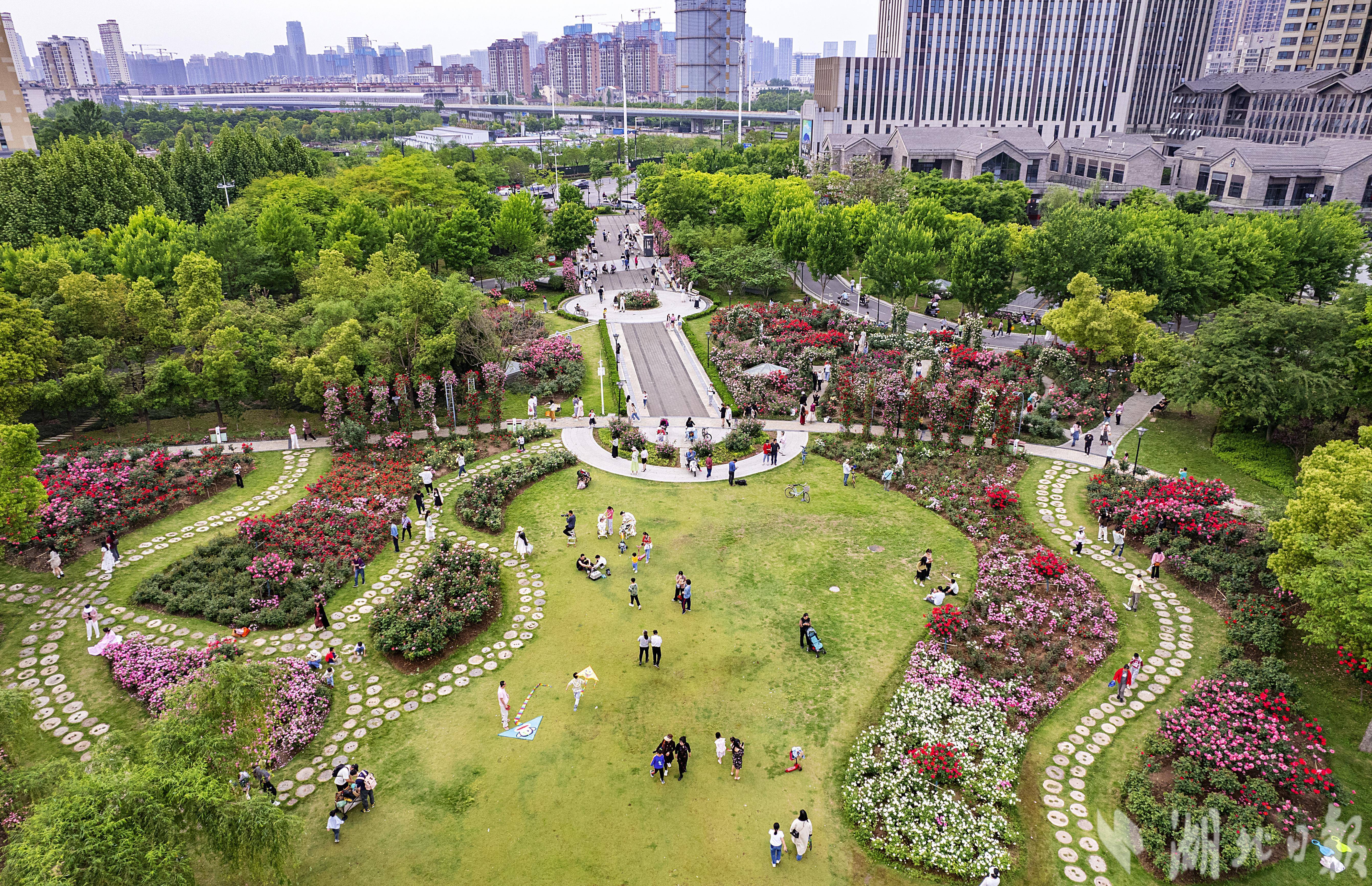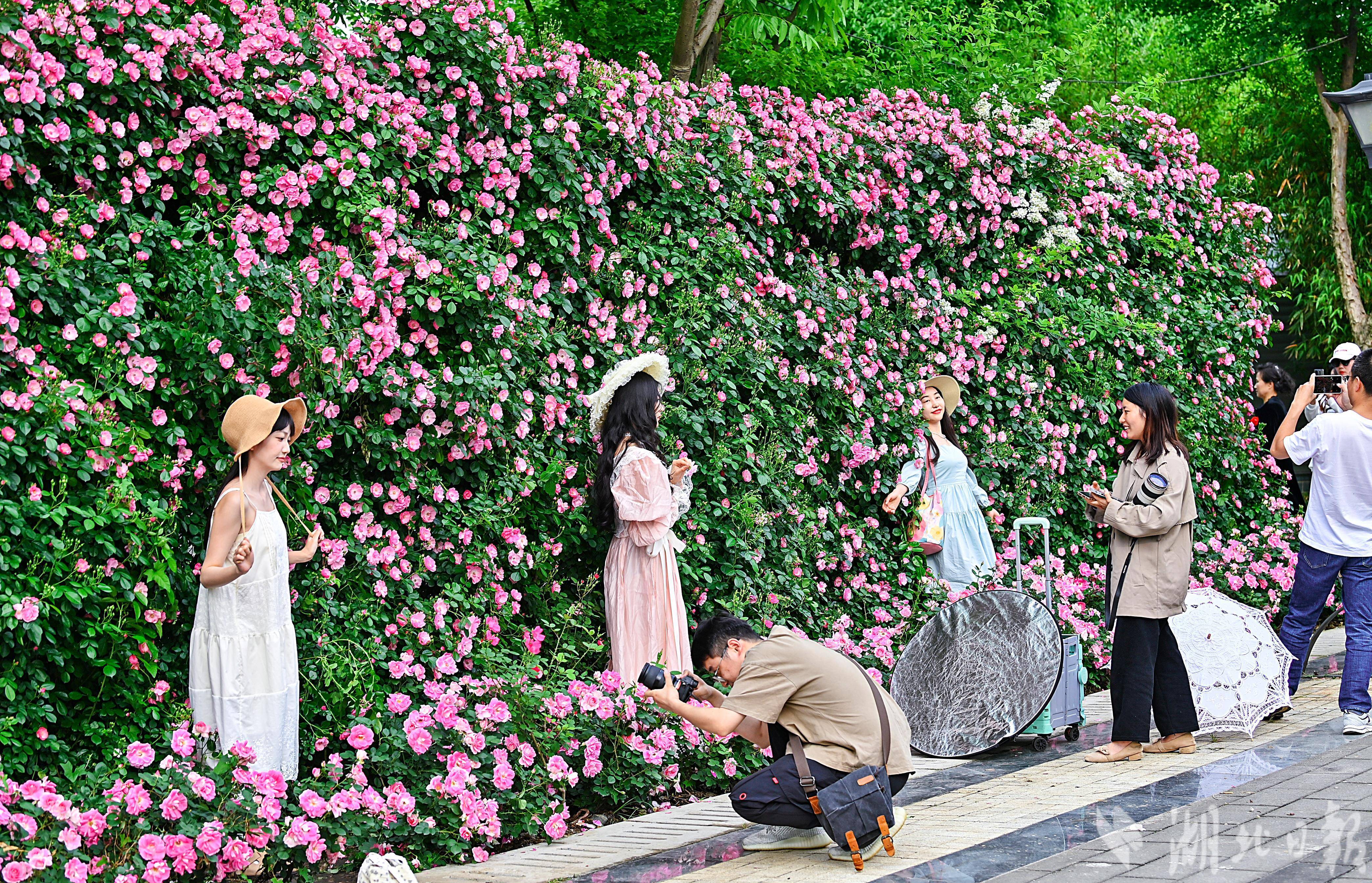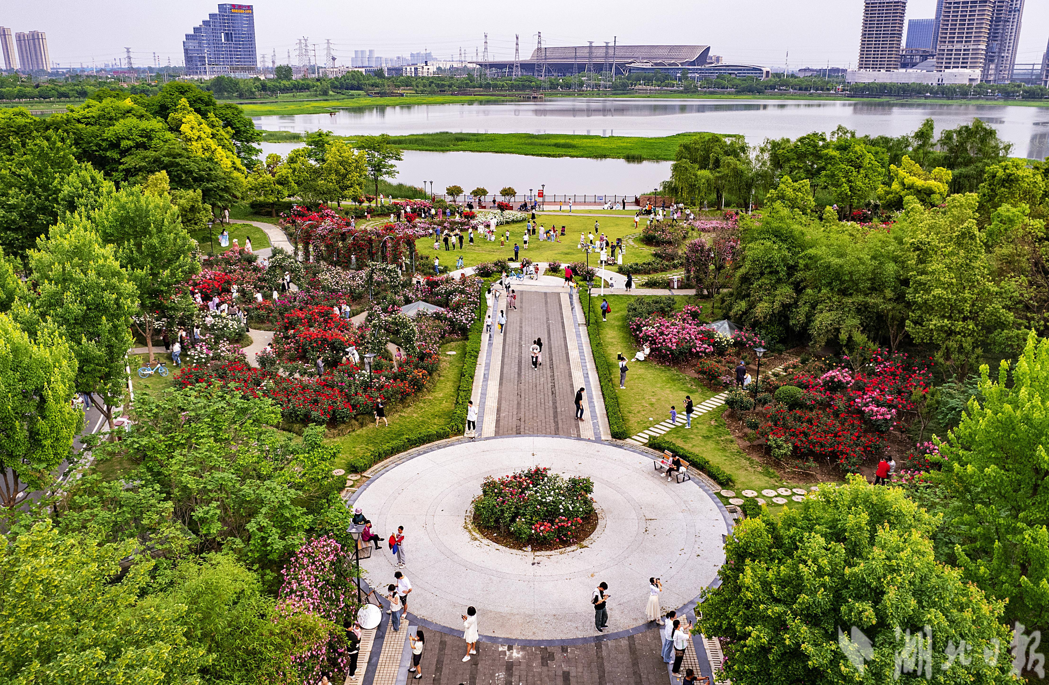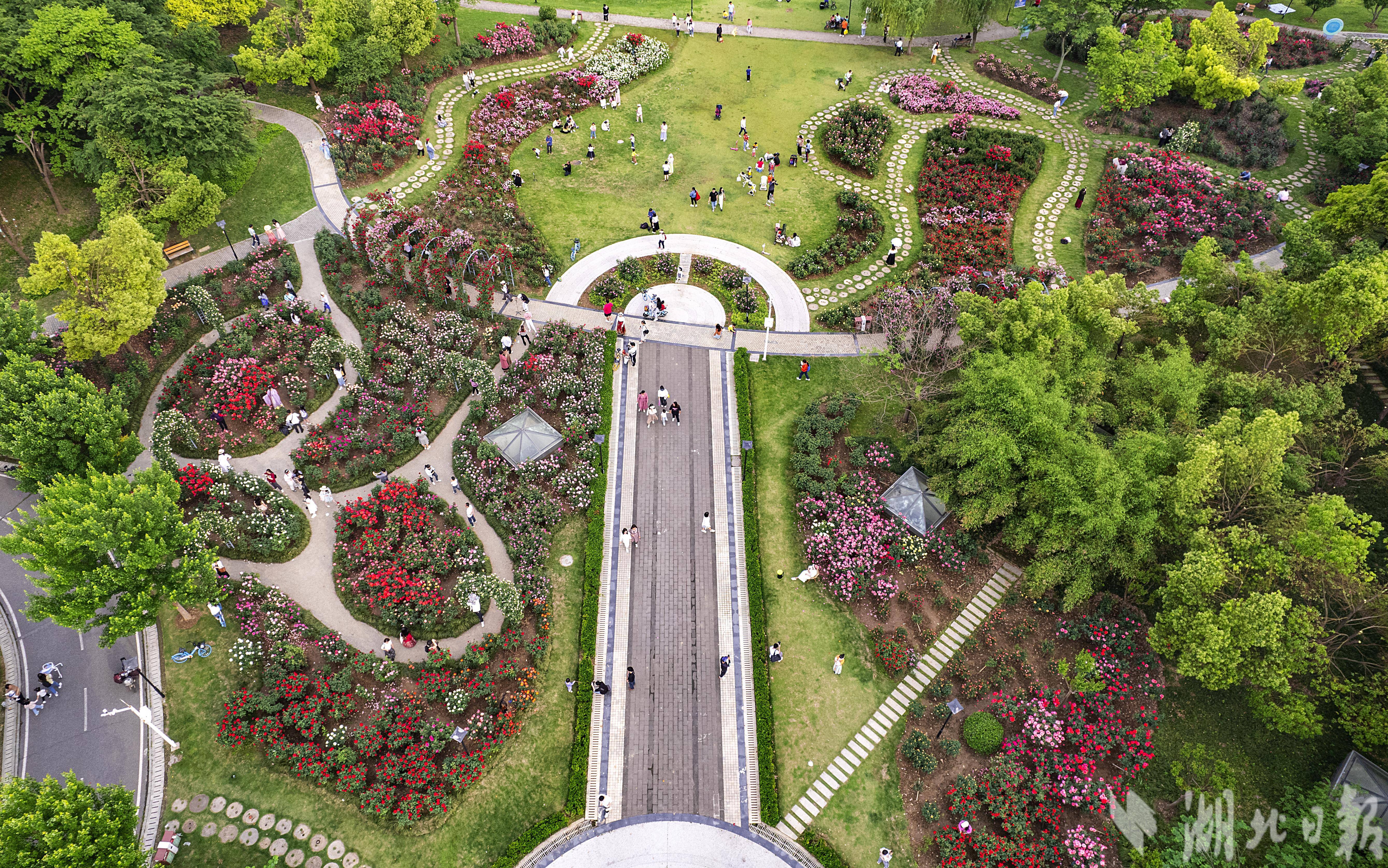 4月20日,武汉市杨春湖湿地公园西区月季专类园内,近百个品种的月季花绽放,将整个公园装点成一片色彩斑斓的花海,吸引了众多游人前来赏花。