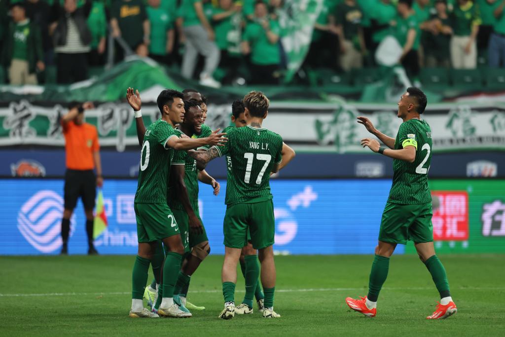 4月21日,北京国安队球员阿德本罗(左二)打进球队本场第四粒进球后与队友庆祝。新华社记者 王楷焱 摄