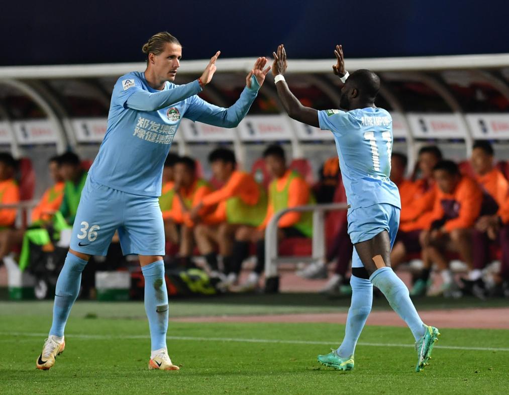 4月21日,河南队球员阿奇姆彭(右)进球后与队友庆祝。新华社记者 李嘉南 摄