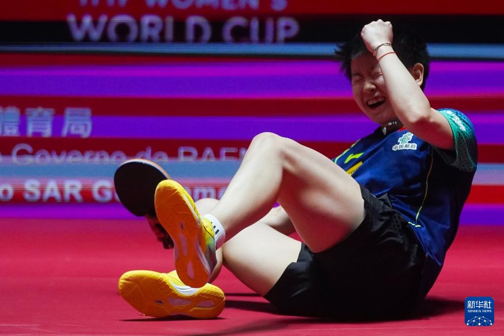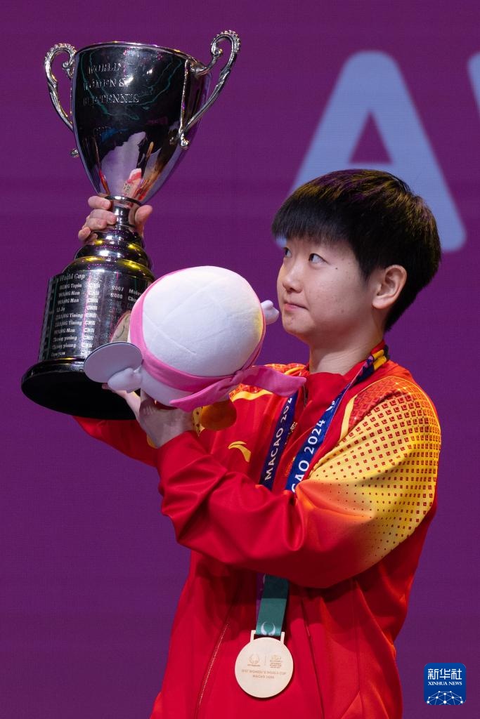 当日,在2024年澳门国际乒联女子世界杯决赛中,中国选手孙颖莎4比3战胜队友王曼昱,夺得冠军。