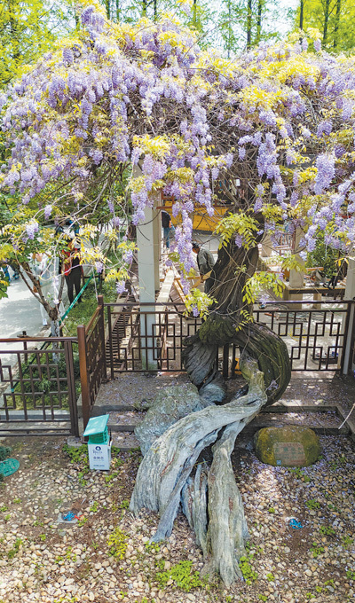 郑和公园在明代是郑和家的花园所在,见证了岁月变迁。但在历史的长河中,由于战乱或者自然原因,许多庭院和园林毁坏荒芜了,古树名木也在风雨中艰难生长。新中国成立后,许多私家园林打开院门,建设成公园,附近群众自发对古树名木进行照护。1982年,当时的国家城建总局印发《关于加强城市和风景名胜区古树名木保护管理的意见》。1984年,《南京市园林绿化管理规定》发布,明确对南京的古树名木要重点管护,严禁破坏。2011年,《南京市古树名木保护和管理办法》出台。这株紫藤由郑和公园负责日常养护,每天两次巡逻,包括清理杂草、检查外观等,每月还有两次专业检查,第三方公司带着养护工具上门,修剪枯枝、上药防虫,清理空洞。