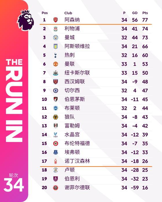 英超积分榜。图片来源:英超联赛