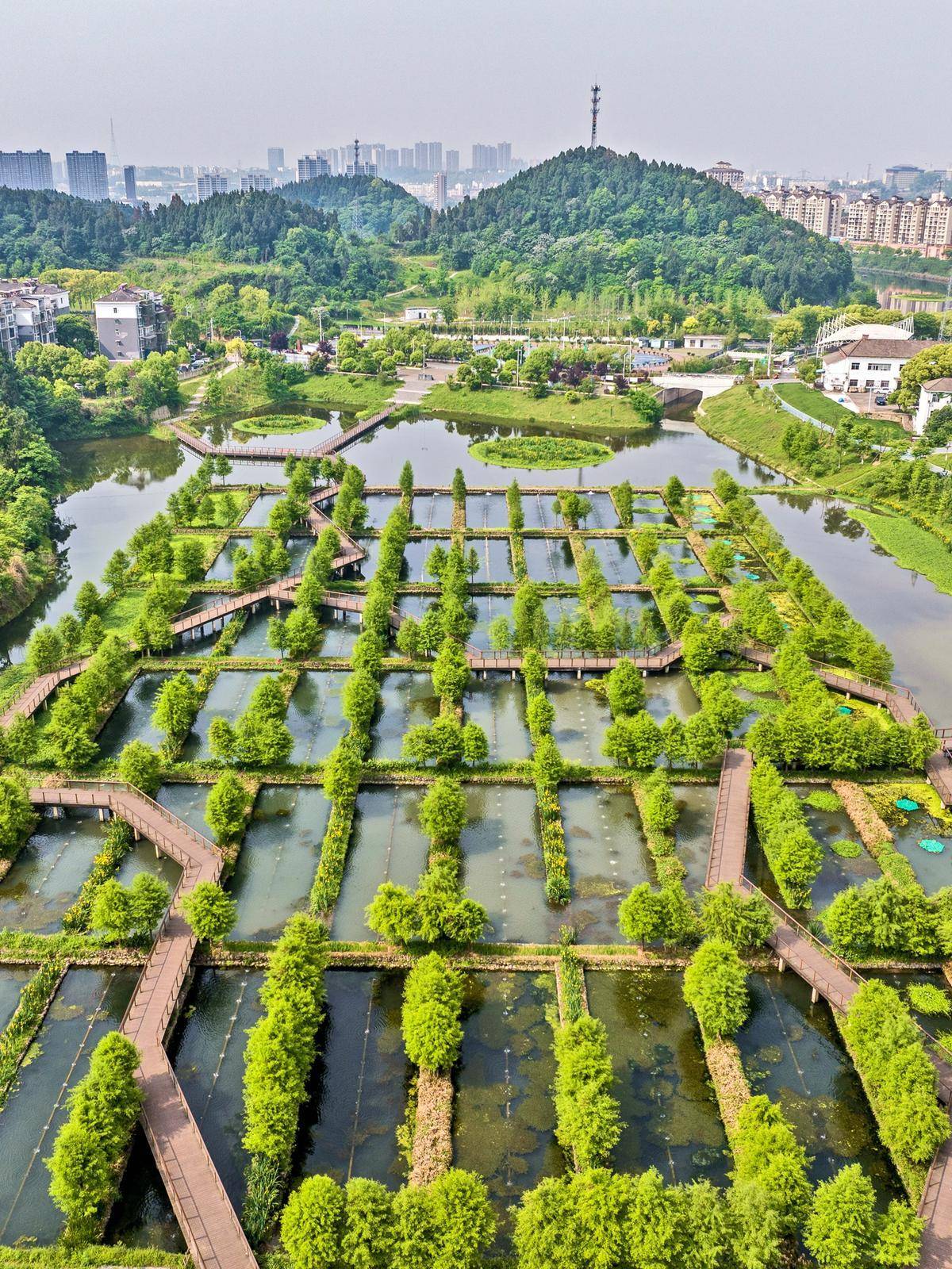 “一个池子就是一道处理工序,经过60道工序后,污水能达到地表Ⅳ类水标准,并流入池塘。”该工作人员介绍,每个长方形的水池能存储1万立方米上游来水,第一道水池先隔绝砂砾等固形垃圾,净化后的水通过管道进入第二个水池沉淀,再依次循环,通过最后一个水池后流向湿地。