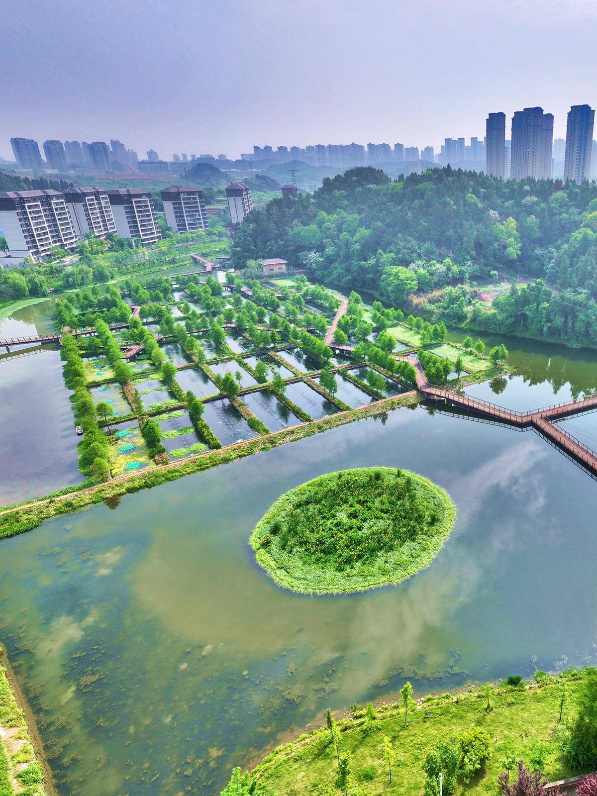 湿地中心一块圆形生态浮岛则为流入的水进行再次净化。为保持水体生态系统稳定,还引入水体曝氧机,用来增加河水含氧量,帮助水体循环和水生植物生长。