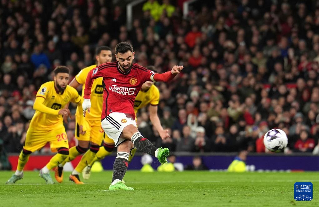 4月24日,曼联队球员费尔南德斯在比赛中射门得分。新华社/美联