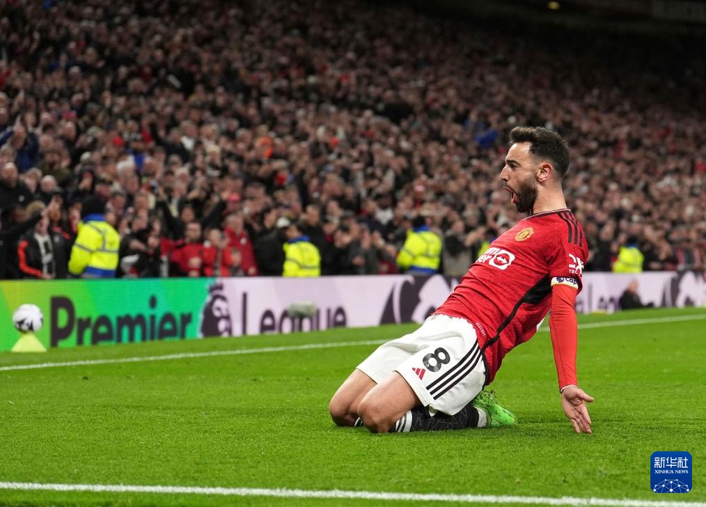 4月24日,曼联队球员费尔南德斯在比赛中庆祝进球。新华社/美联