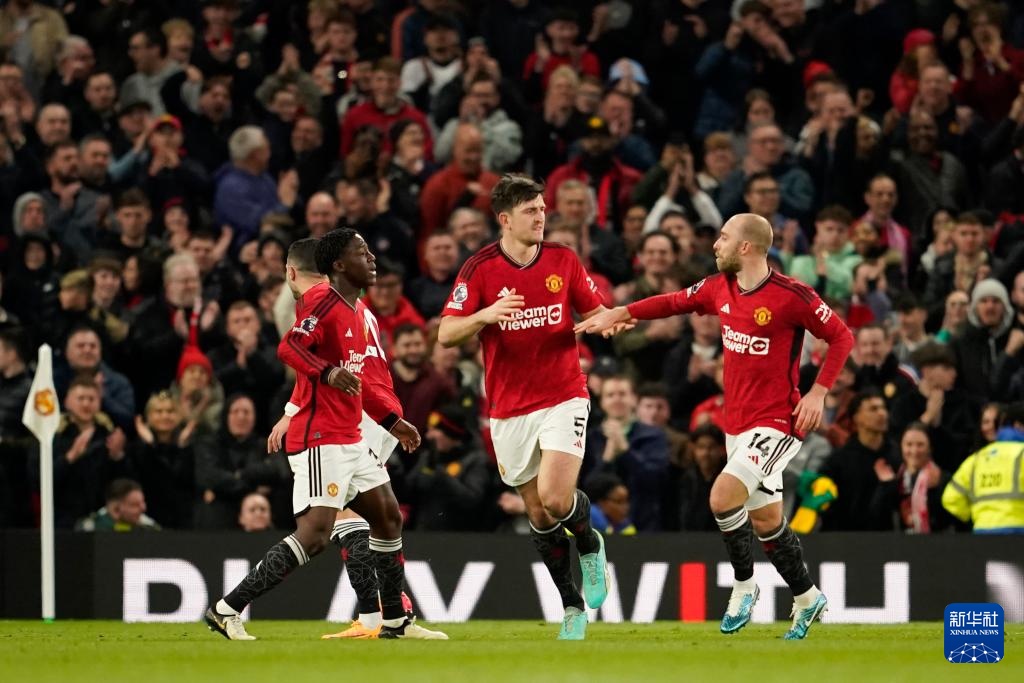 4月24日,曼联队球员马奎尔(右二)在比赛中庆祝进球。新华社/美联