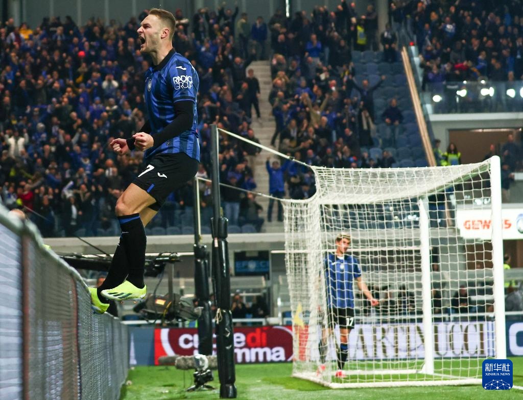4月24日,亚特兰大队球员库普梅纳斯庆祝进球。新华社发(阿尔贝托·林格利亚摄)