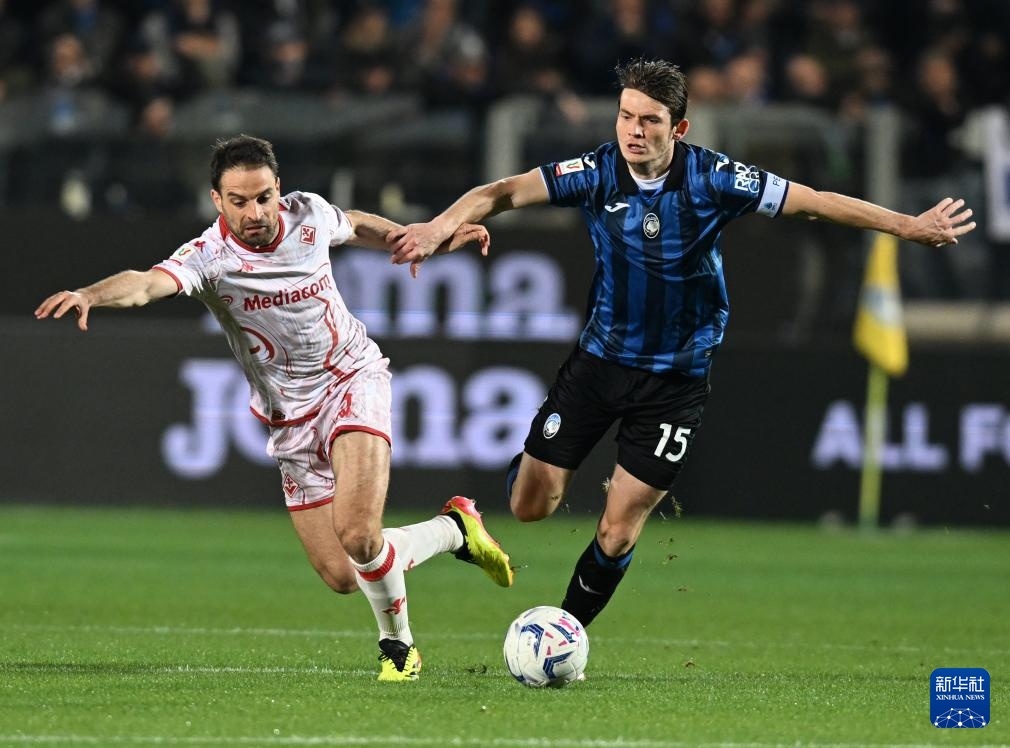 4月24日,亚特兰大队球员德凯特拉雷(左)与佛罗伦萨队球员拉涅里在比赛中拼抢。新华社发(阿尔贝托·林格利亚摄)