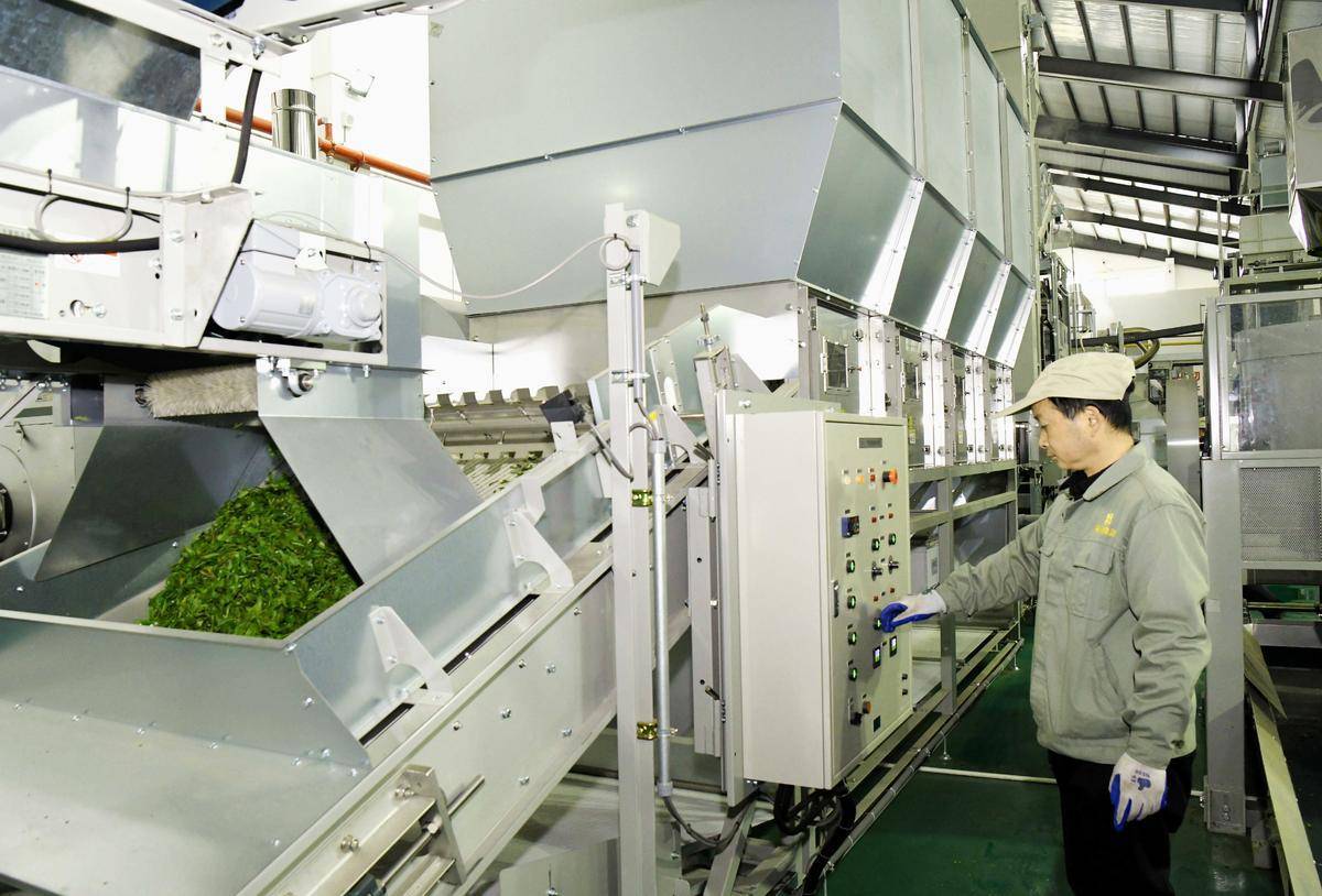 4月19日,在保康茶业集团有限公司智能化加工车间,工人将新鲜茶叶倒入原料传送带。其间的水洗、揉捏、杀青、烘干等14道制茶工艺全都是自动化处理。