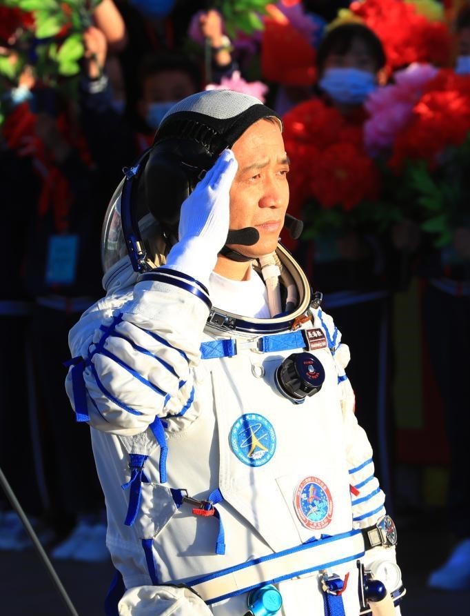 2021年6月17日,神舟十二号航天员出征仪式在酒泉卫星发射中心举行。这是航天员聂海胜在出征仪式上敬礼。新华社记者 琚振华 摄