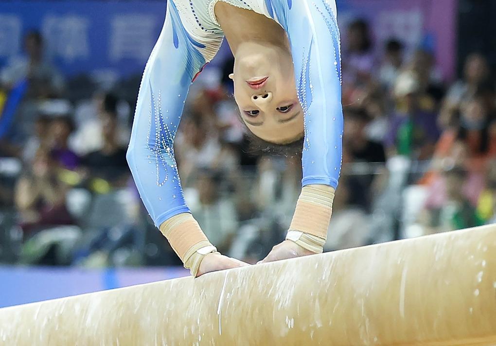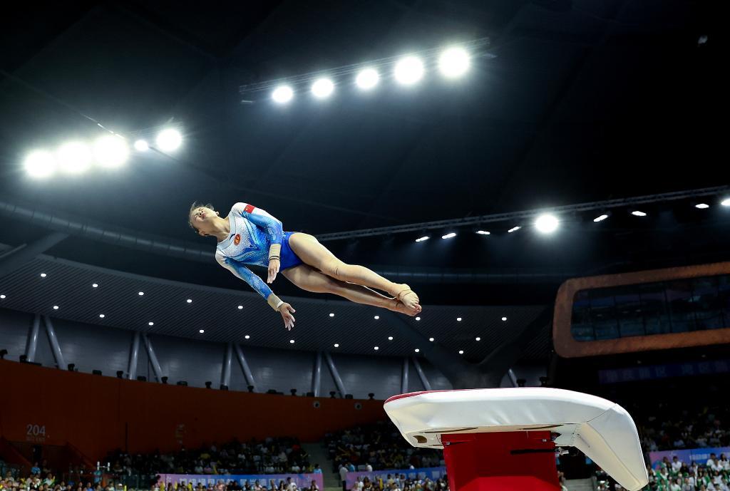 4月27日,福建队选手邱祺缘在跳马比赛中。新华社记者 曹灿 摄