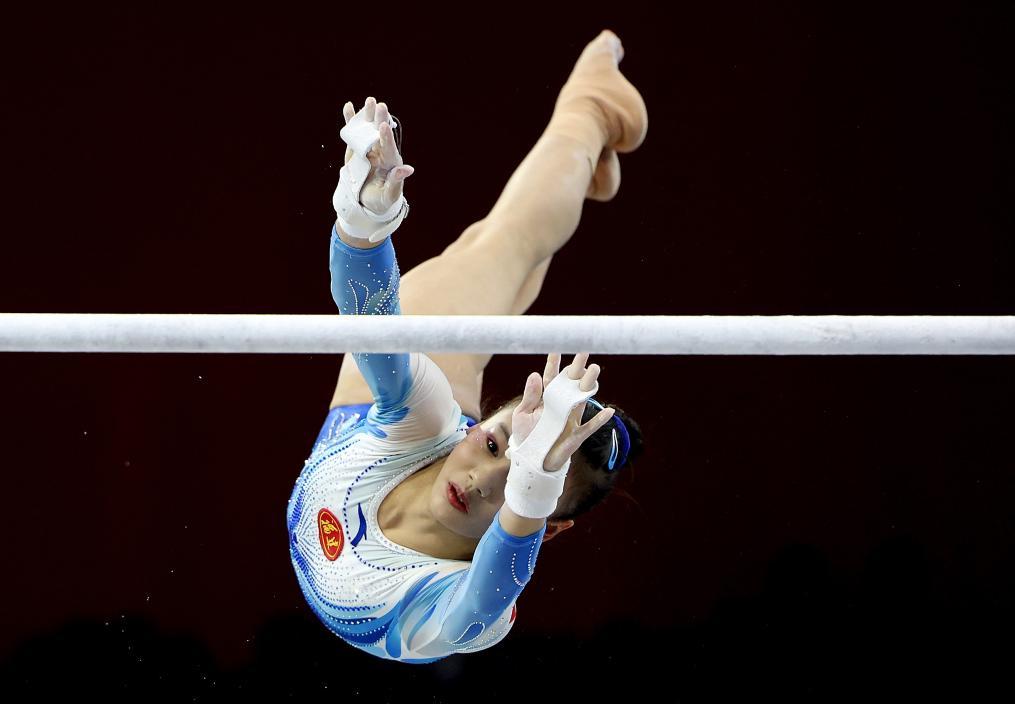 4月27日,福建队选手邱祺缘在高低杠比赛中。新华社记者 曹灿 摄