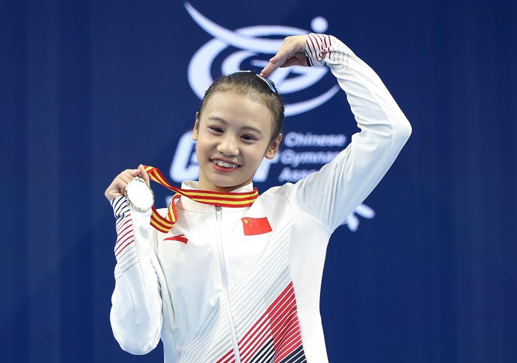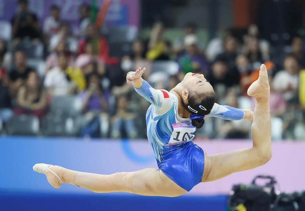 4月27日,福建队选手邱祺缘在自由操比赛中。新华社记者 曹灿 摄
