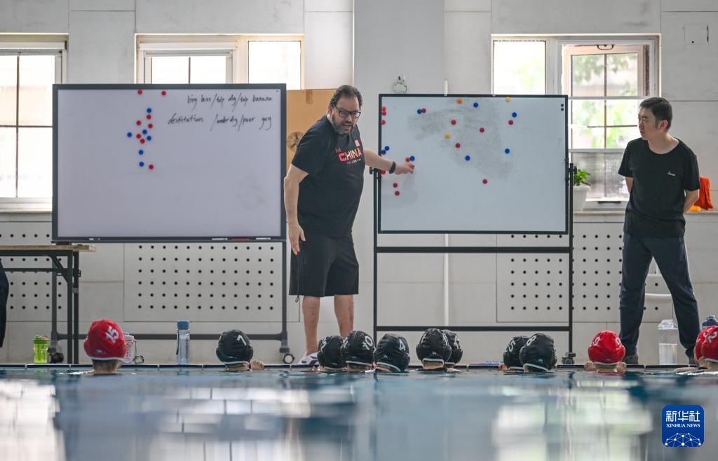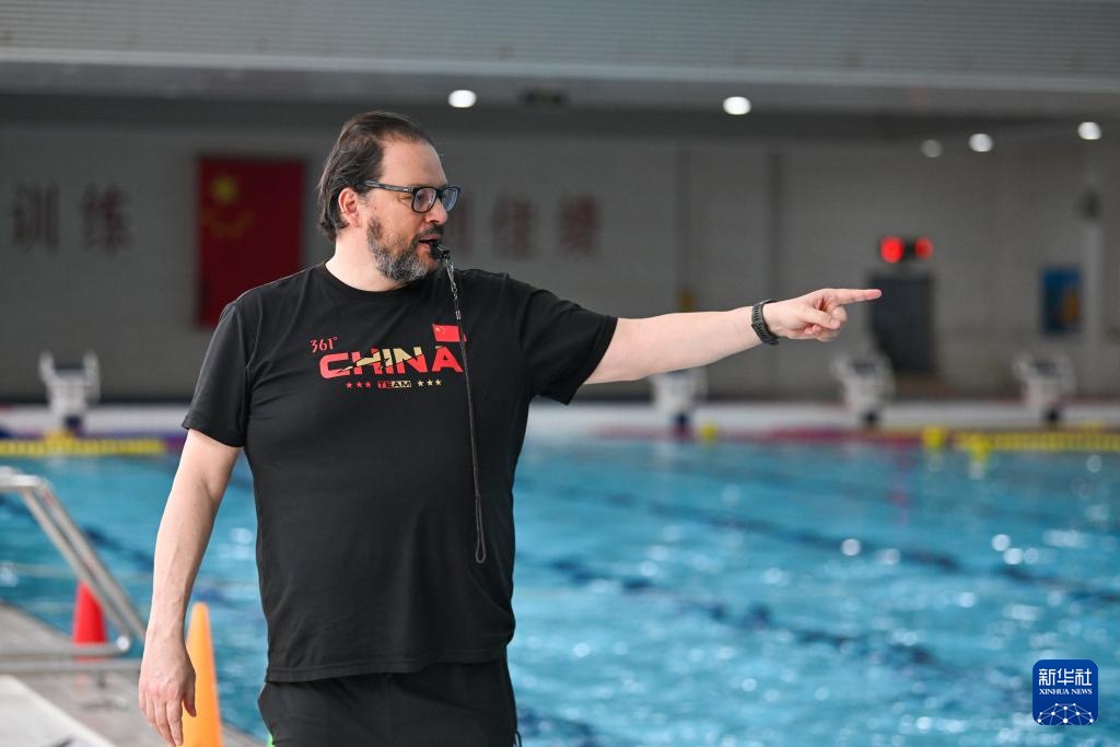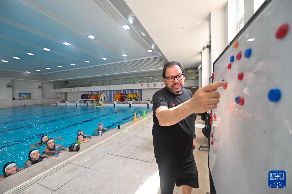 塞奥哈里斯(中)在泳池边指导球队进行训练(4月24日摄)。新华社记者 孙凡越 摄